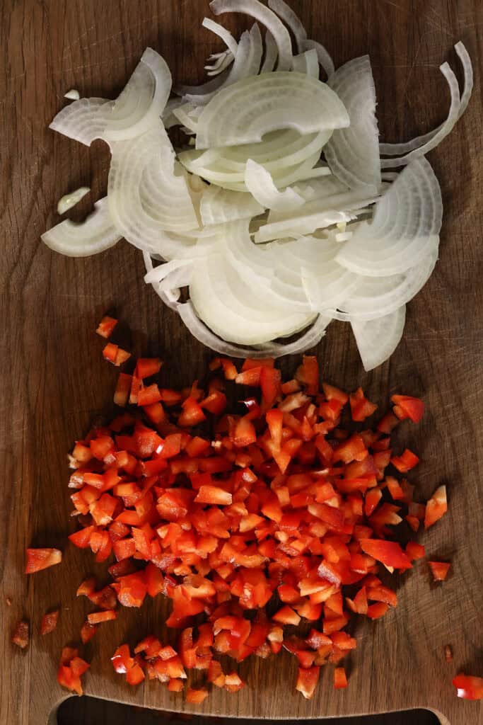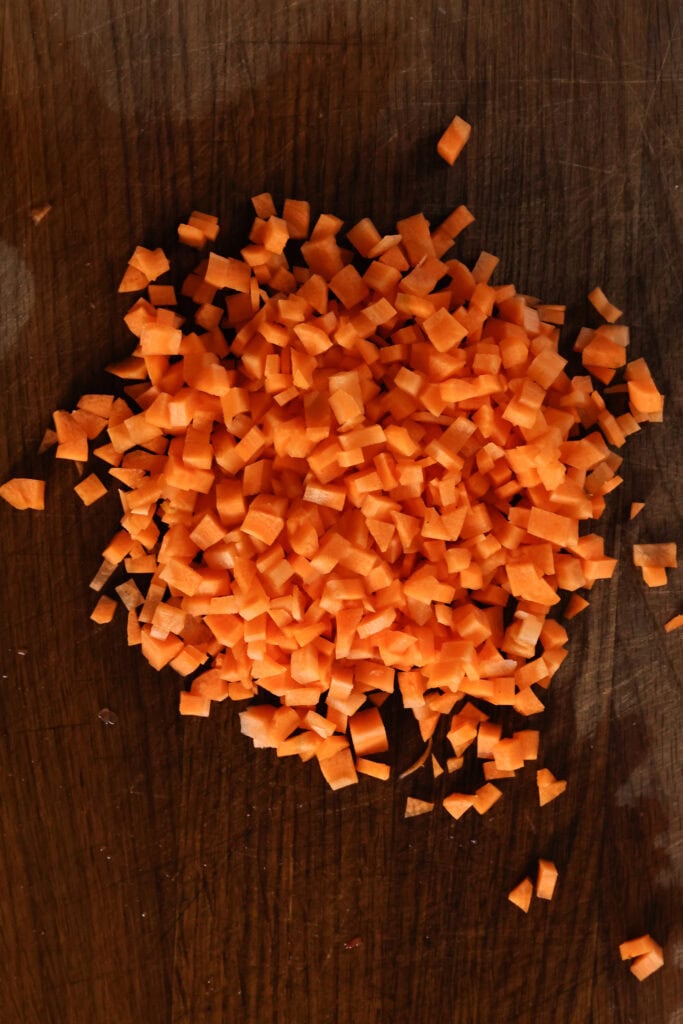 - Finely dice the carrots and bell pepper and set them aside.1 large carrot (finely diced), 1 red bell pepper (finely diced)