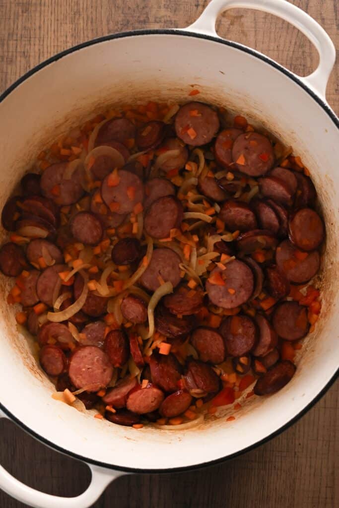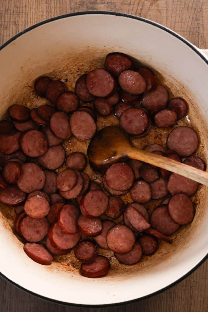 - Brown the sausages: In a large pot or Dutch oven, brown the sausages on all sides.