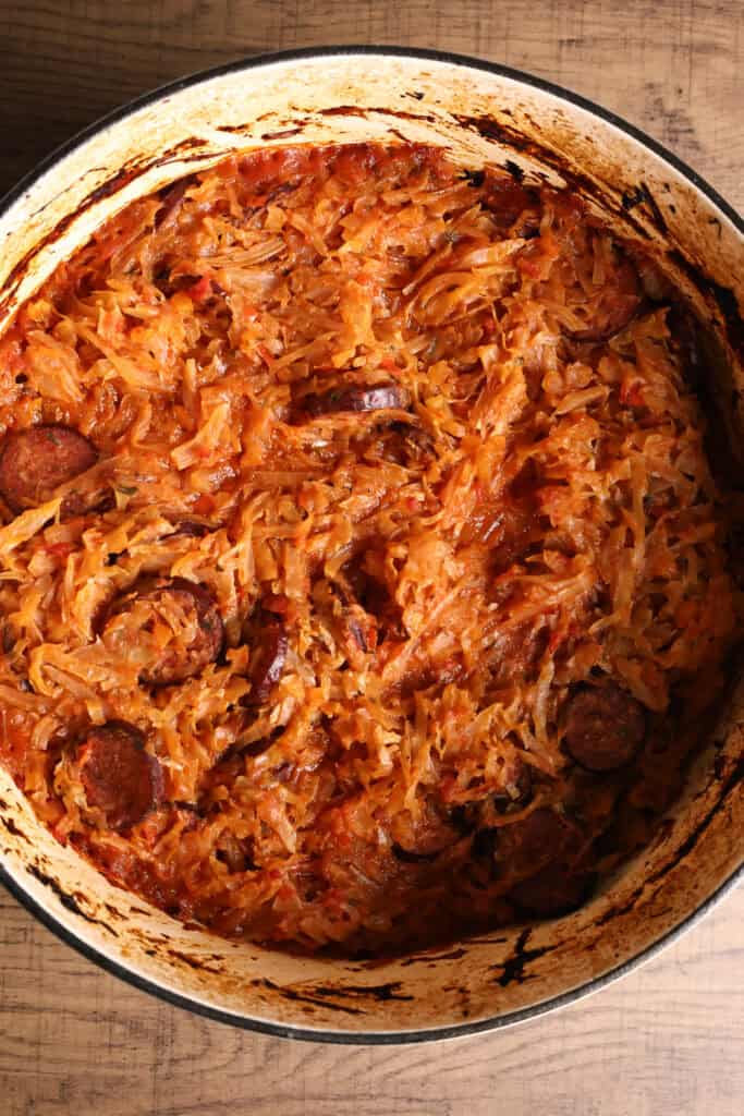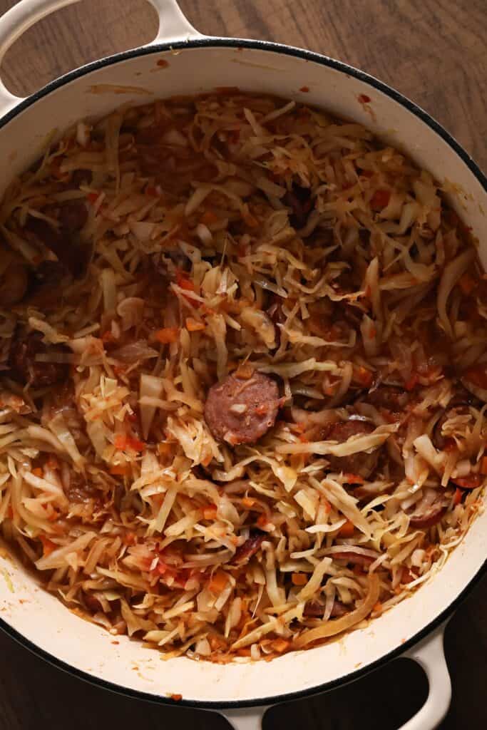 - Finish in the oven: Put the lid on the casserole and place it in the oven. Bake at 400°F/200°C for 1 to 2 hours or until the cabbage is soft and cooked through. Take the lid off and let it bake for another 10 minutes.